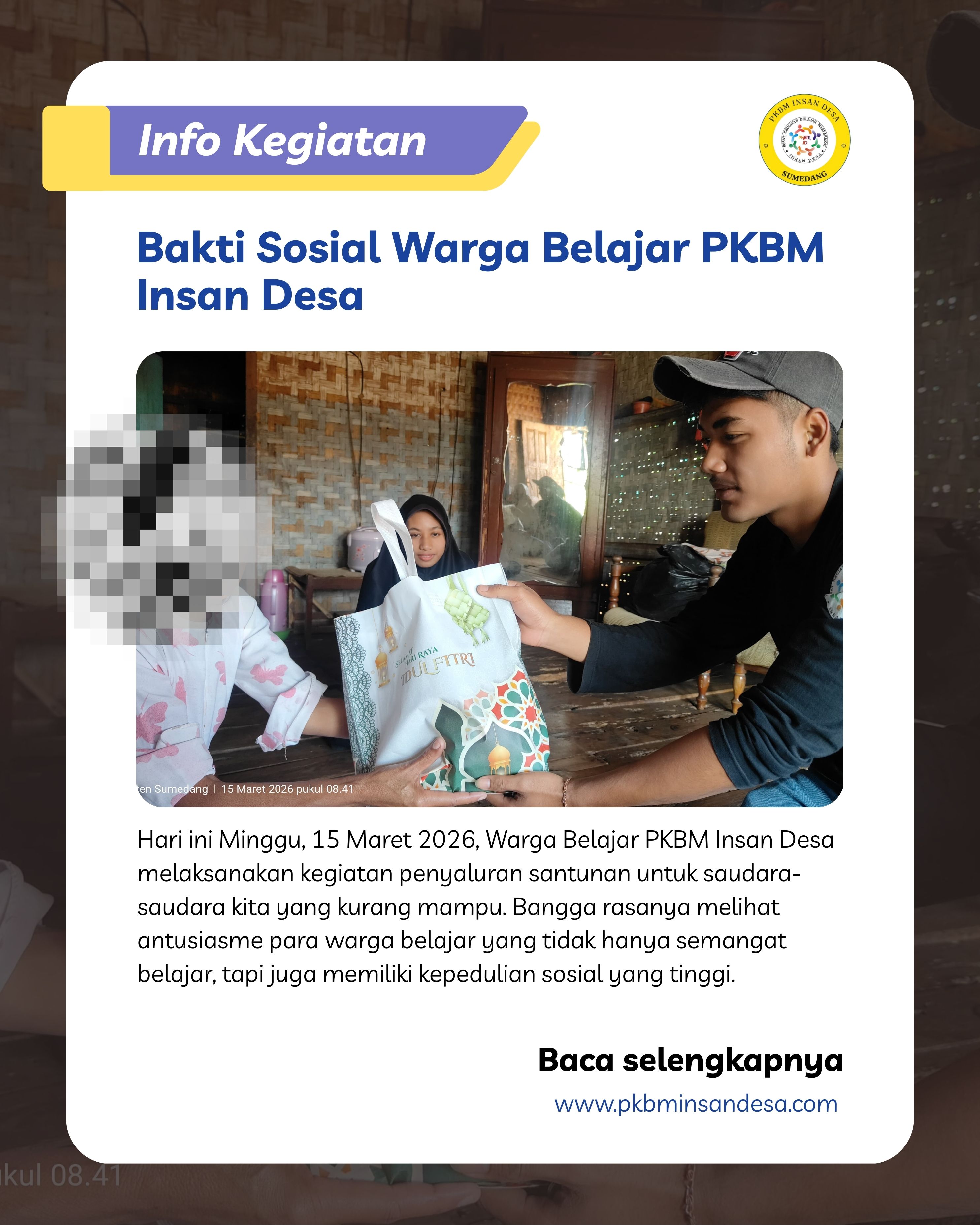 Sumedang, Cibugel — Pendidikan karakter dan empati tidak hanya dipelajari di dalam ruang kelas. Hal ini dibuktikan secara nyata oleh para Warga Belajar Pusat Kegiatan Belajar Masyarakat (PKBM) Insan Desa melalui kegiatan bakti sosial penyaluran santunan kepada sejumlah warga prasejahtera di lingkungan Desa Tamansari, Desa Cipasang, Desa Buanamekar dan Desa Jayamandiri pada hari Minggu, 15 Maret 2026.